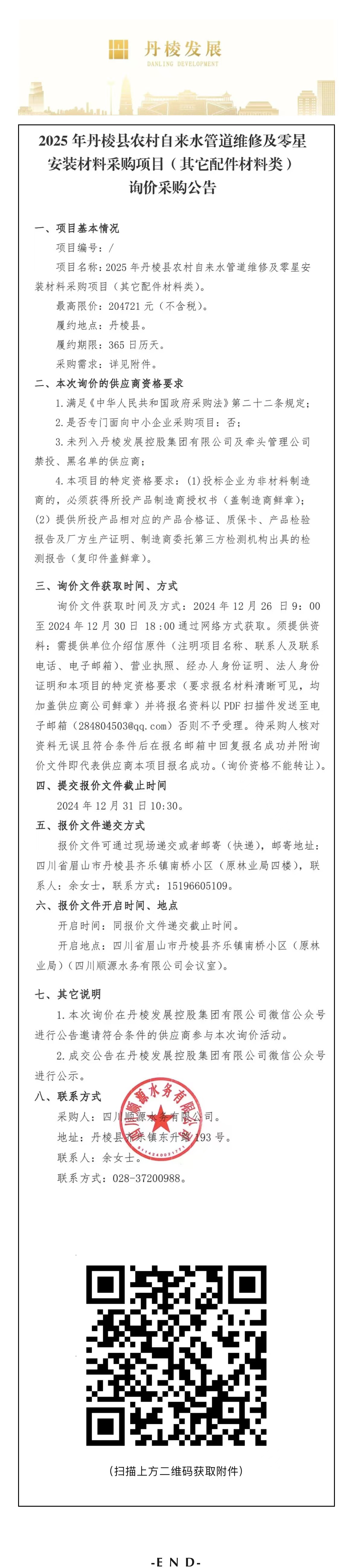 2025年丹棱縣農(nóng)村自來(lái)水管道維修及零星安裝材料采購(gòu)項(xiàng)目(其他配件材料類(lèi))詢(xún)價(jià)采購(gòu)公告