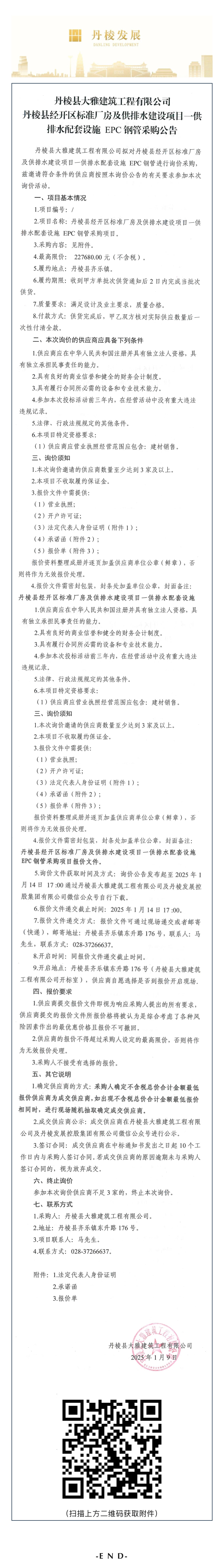 丹棱縣大雅建筑工程有限公司丹棱縣經開區(qū)標準廠房及供排水建設項目一供排水配套設施 EPC鋼管采購公告