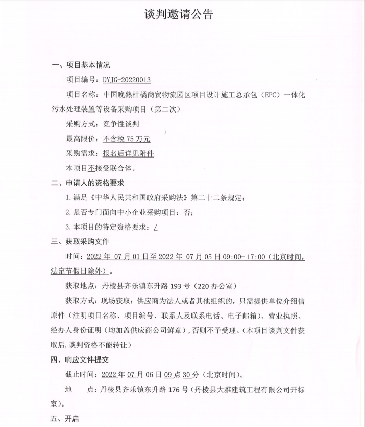 中國晚熟柑橘商貿(mào)物流園區(qū)項(xiàng)目設(shè)計(jì)施工總承包(EPC)一體化污水處理裝置等設(shè)備采購項(xiàng)目第二次談判邀請公告