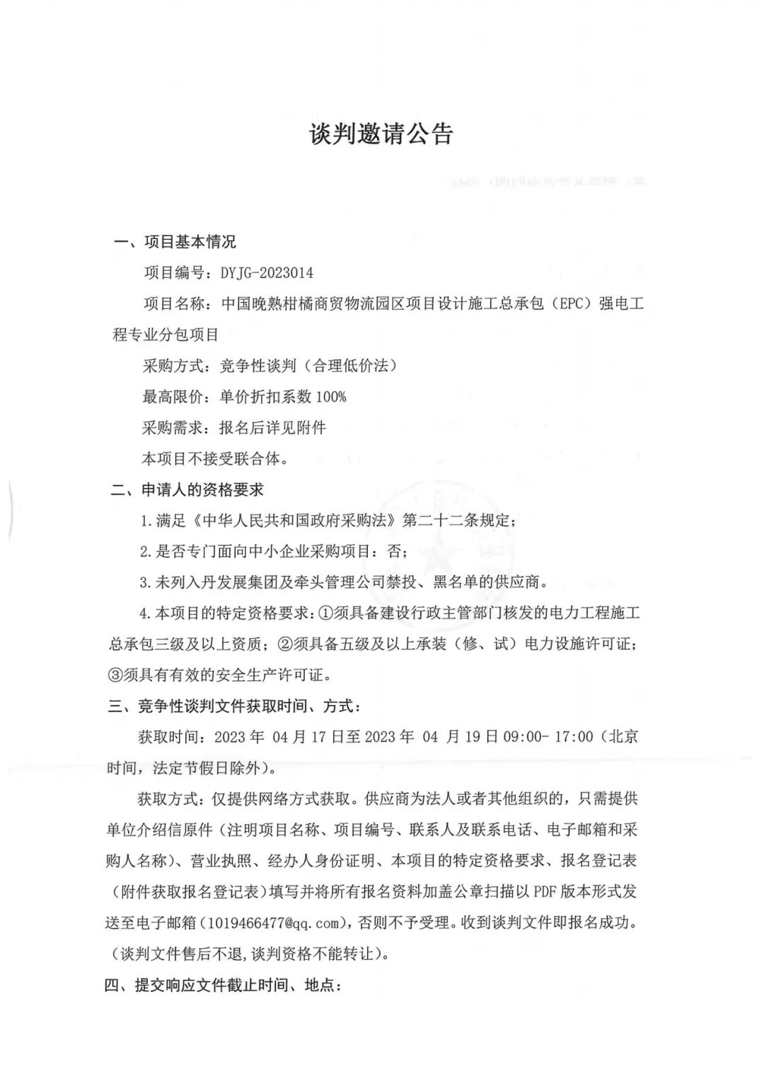 中國(guó)晚熟柑橘商貿(mào)物流園區(qū)項(xiàng)目設(shè)計(jì)施工總承包(EPC)強(qiáng)電工程專業(yè)分包項(xiàng)目談判邀請(qǐng)公告