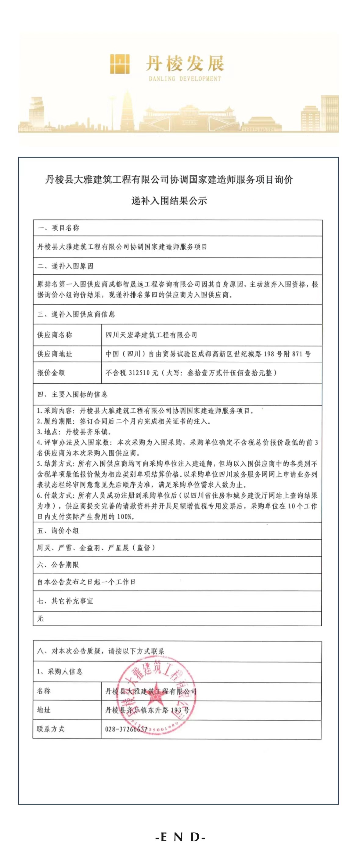 丹棱縣大雅建筑工程有限公司協(xié)調(diào)國家建造師服務項目詢價遞補入圍結果公示