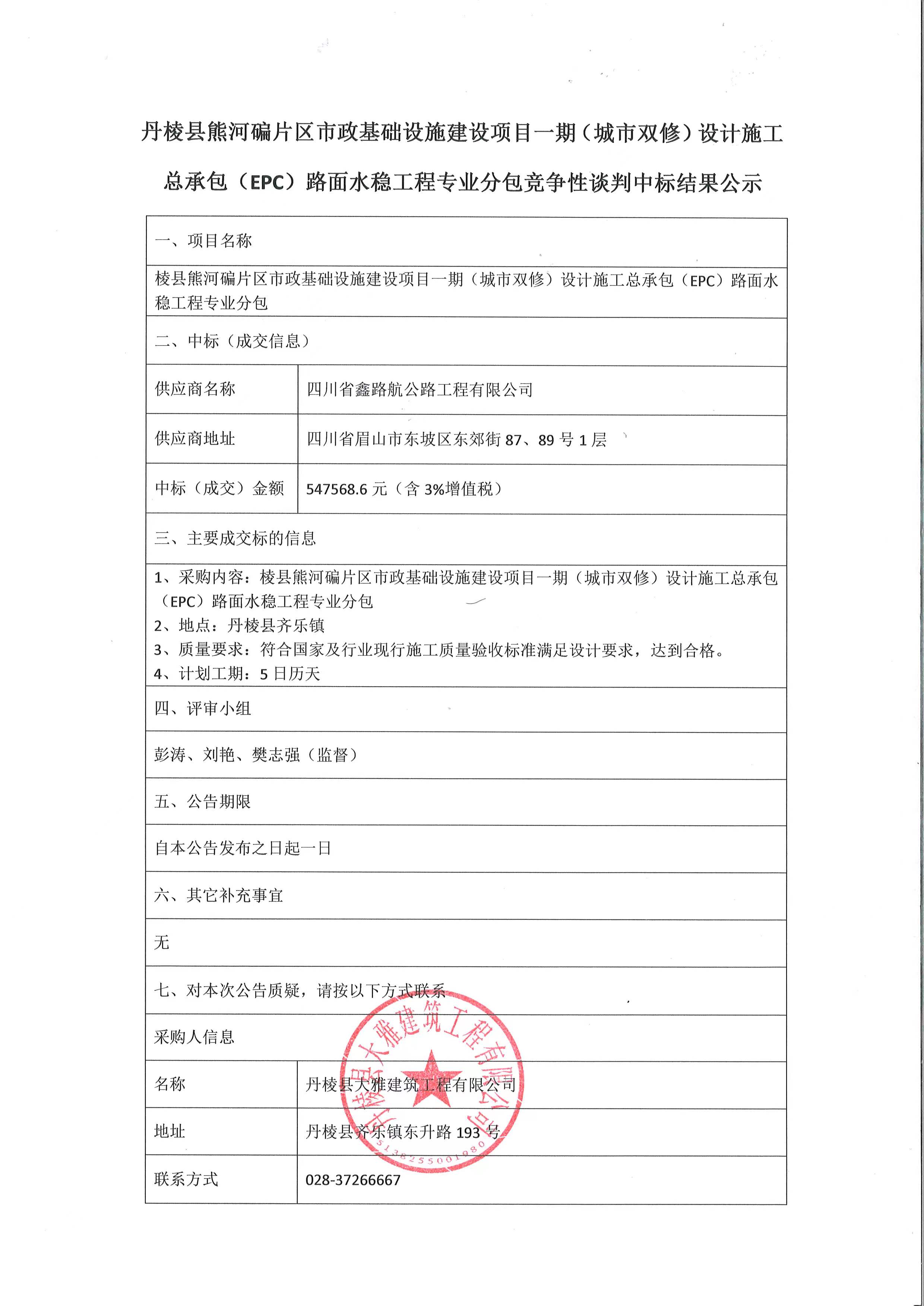 丹棱縣熊河碥片區(qū)市政基礎(chǔ)設(shè)施建設(shè)項(xiàng)目一期(城市雙修)設(shè)計(jì)施工總承包(EPC)路面水穩(wěn)工程專(zhuān)業(yè)分包競(jìng)爭(zhēng)性談判中標(biāo)結(jié)果公示
