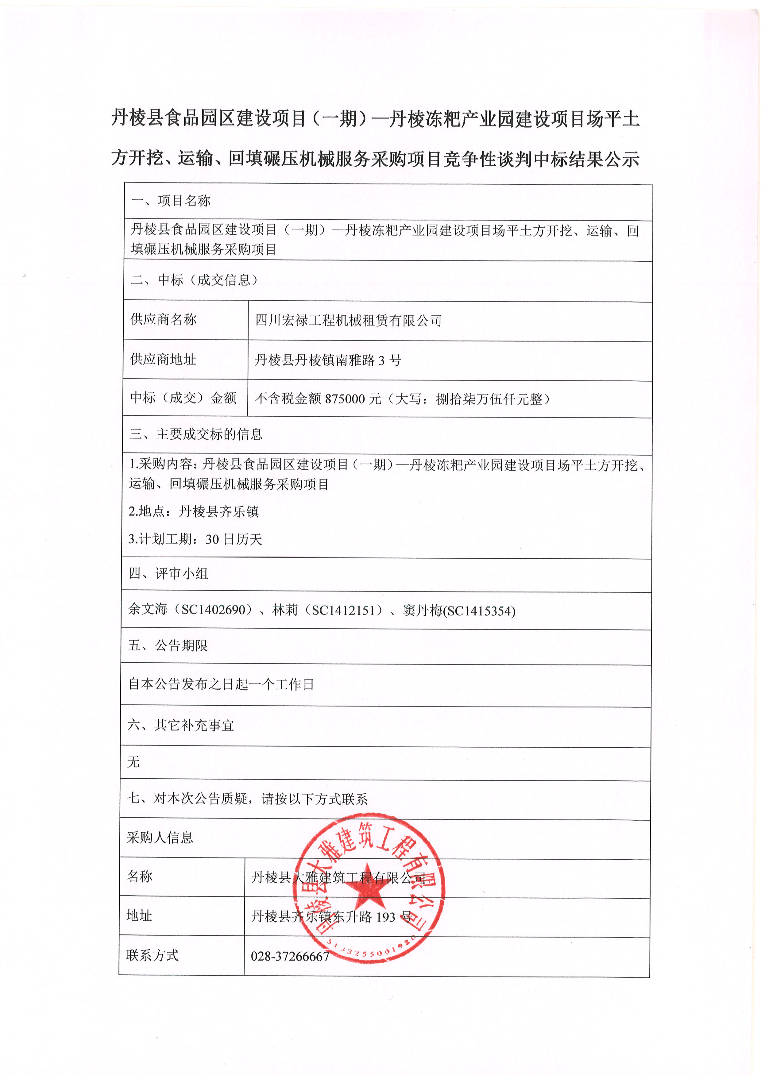 丹棱縣食品園區(qū)建設(shè)項目(一期)-丹棱凍粑產(chǎn)業(yè)園建設(shè)項目場平土 方開挖、運輸、回填碾壓機械服務(wù)采購項目競爭性談判中標(biāo)結(jié)果公示