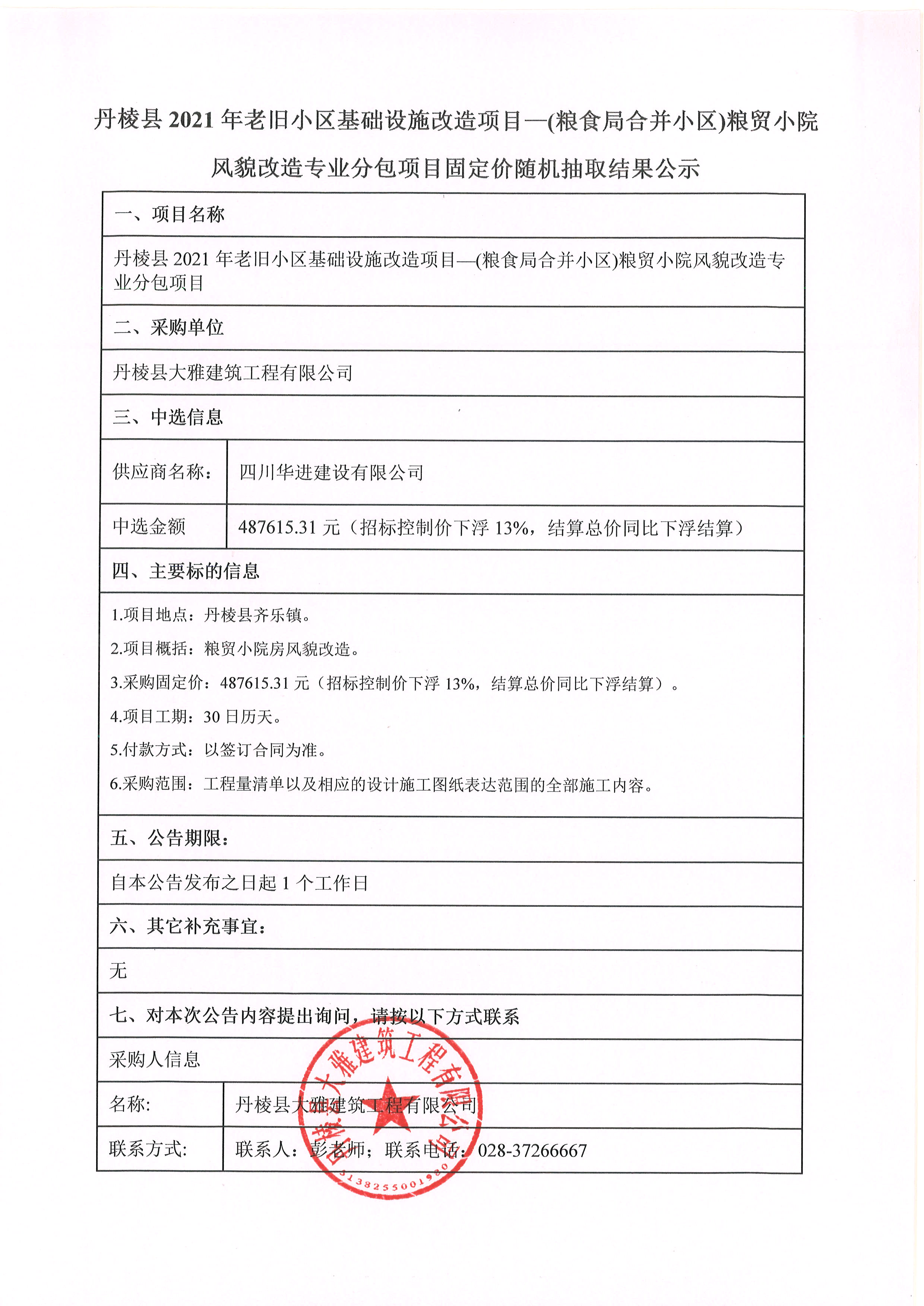 丹棱縣2021年老舊小區(qū)基礎(chǔ)設(shè)施改造項目一(糧食局合并小區(qū))糧貿(mào)小院 風(fēng)貌改造專業(yè)分包項目固定價隨機抽取結(jié)果公示
