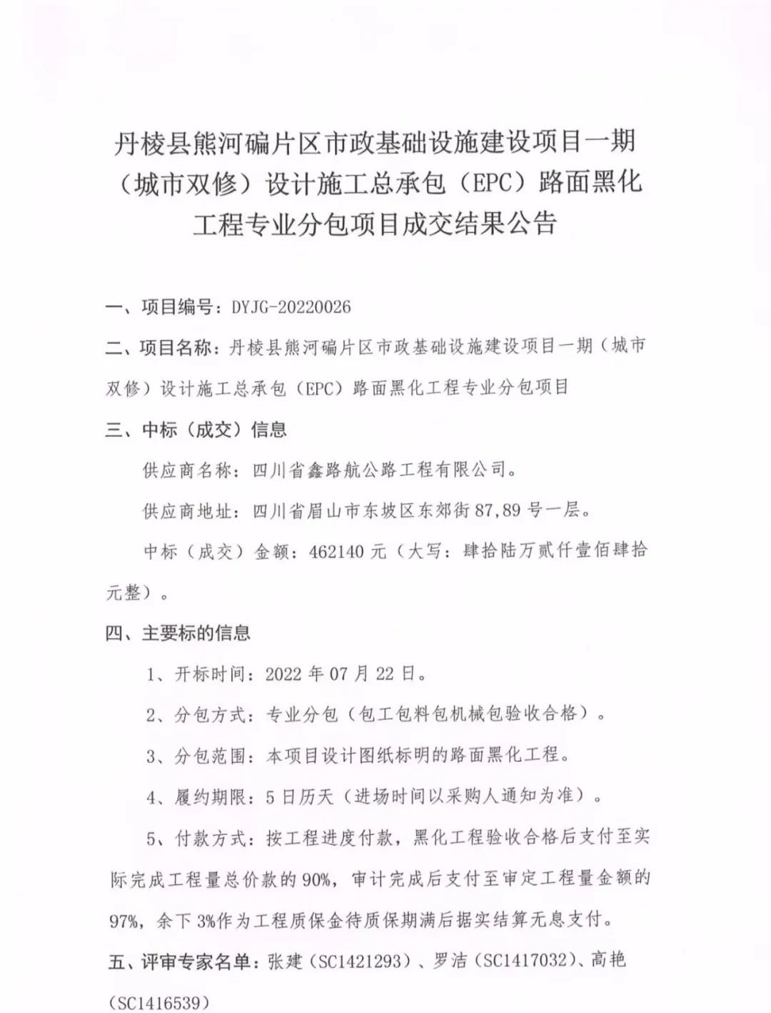 丹棱縣熊河碥片區(qū)市政基礎設施建設項目一期(城市雙修)設計施工總承包(EPC)路面黑化工程專業(yè)分包項目成交結果公告