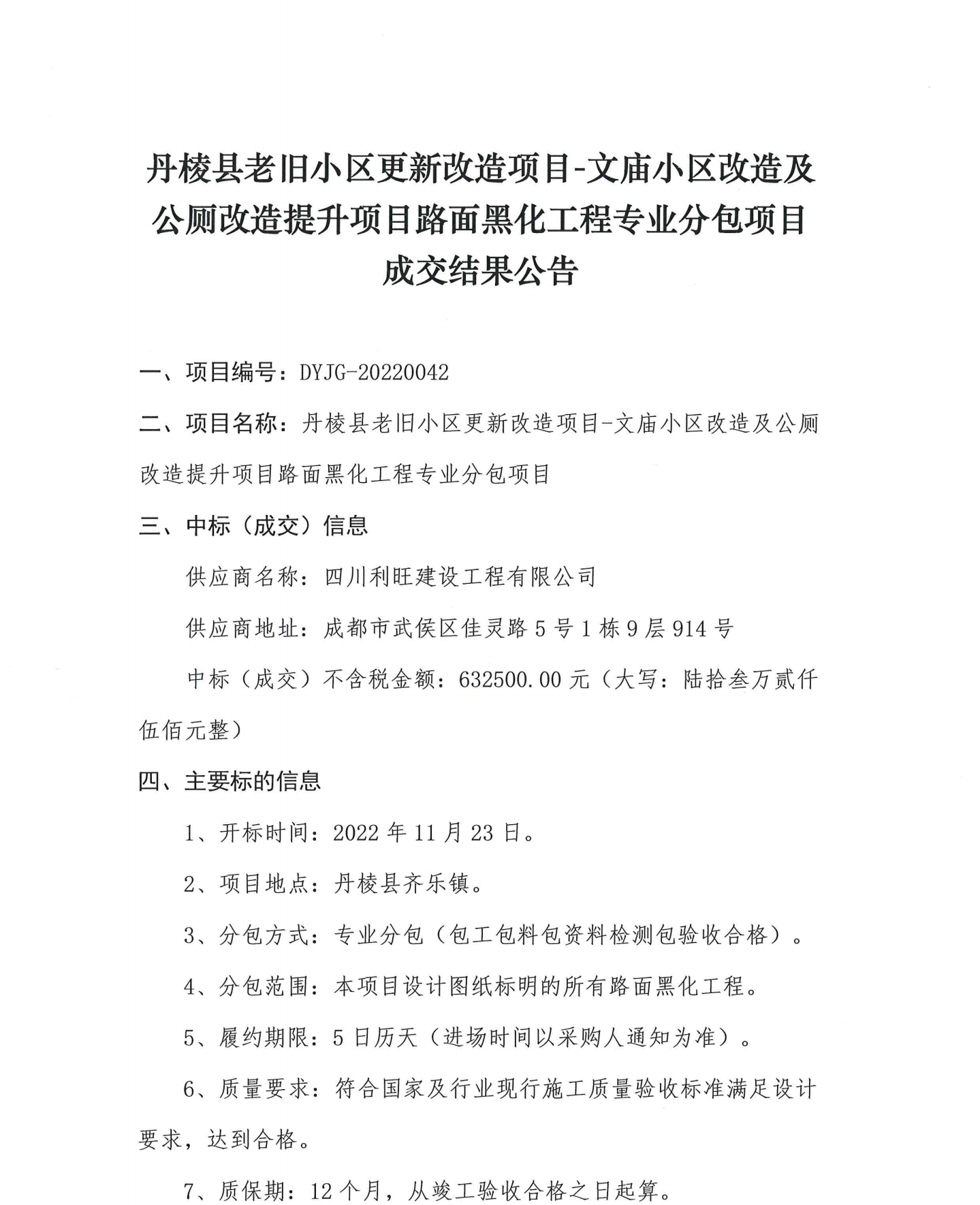 丹棱縣老舊小區(qū)更新改造項(xiàng)目-文廟小區(qū)改造及公廁改造提升項(xiàng)目路面黑化工程專業(yè)分包項(xiàng)目成交結(jié)果公告