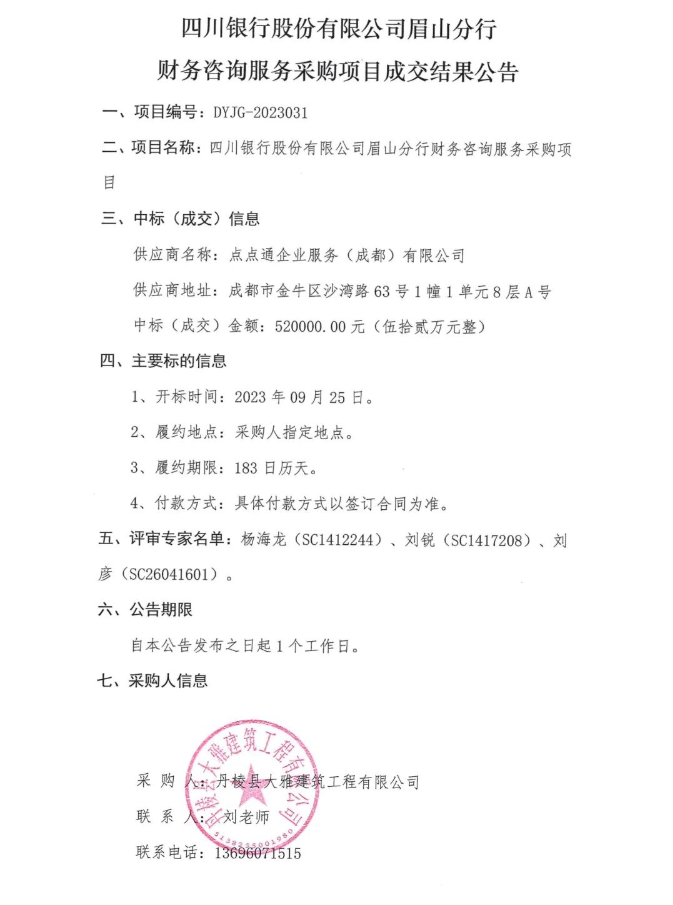 四川銀行股份有限公司眉山分行財務(wù)咨詢服務(wù)采購項(xiàng)目成交結(jié)果公告