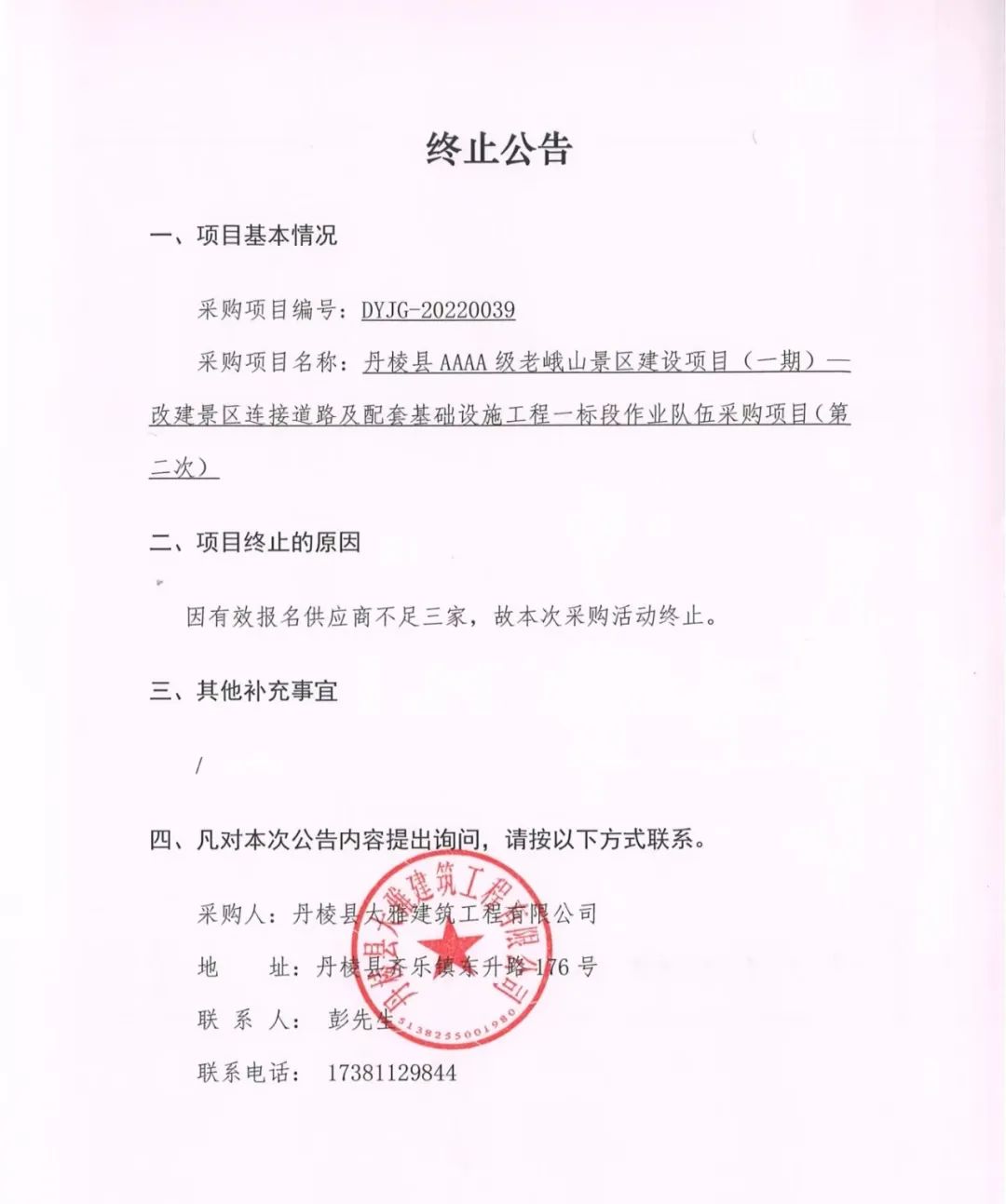 丹棱縣AAAA級(jí)老峨山景區(qū)建設(shè)項(xiàng)目(一期)--改建景區(qū)連接道路及配套基礎(chǔ)設(shè)施工程一標(biāo)段作業(yè)隊(duì)伍采購(gòu)項(xiàng)目(第二次)終止公告