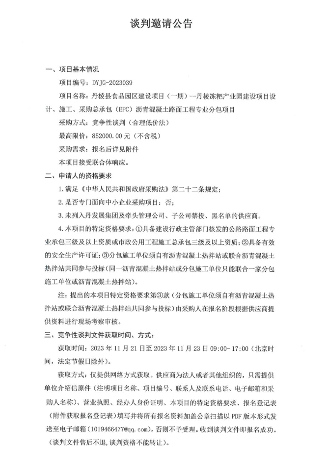 丹棱縣食品園區(qū)建設(shè)項(xiàng)目(一期)—丹棱凍粑產(chǎn)業(yè)園建設(shè)項(xiàng)目設(shè)計(jì)、施工、采購(gòu)總承包(EPC)瀝青混凝土路面工程專業(yè)分包項(xiàng)目談判邀請(qǐng)公告