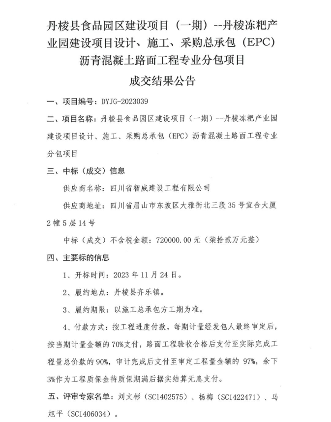 丹棱縣食品園區(qū)建設項目(一期)—丹棱凍粑產業(yè)園建設項目設計、施工、采購總承包(EPC)瀝青混凝土路面工程專業(yè)分包項目成交結果公告
