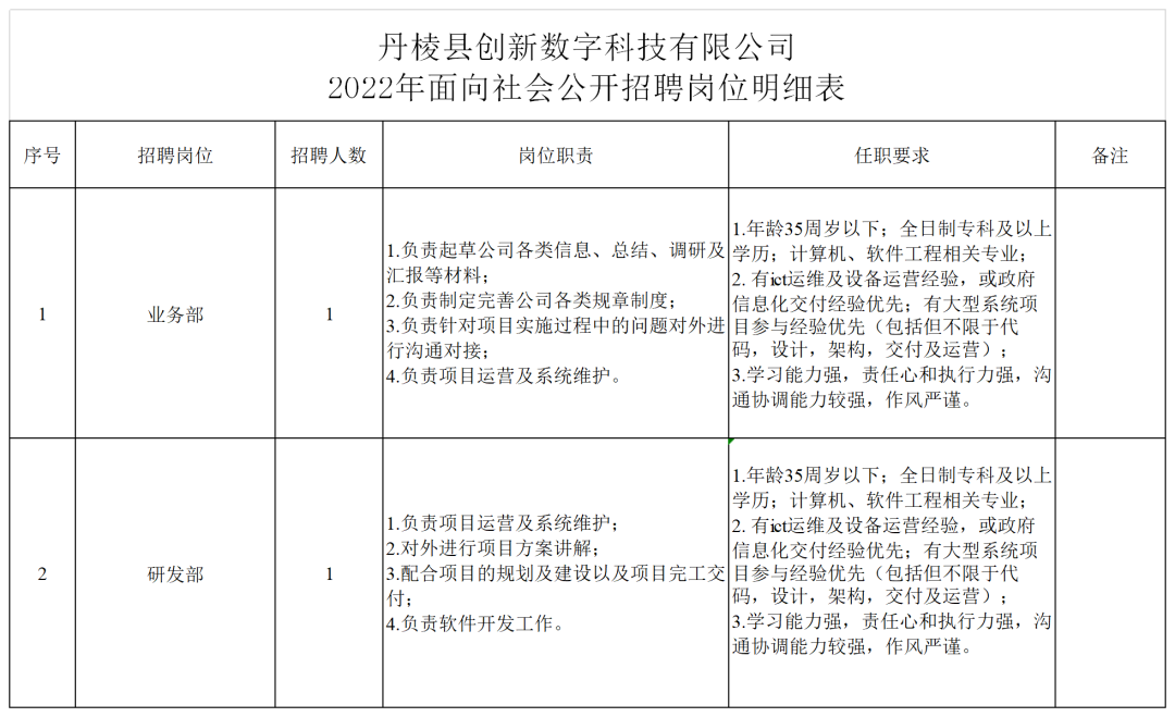 招聘崗位的學(xué)歷、專業(yè)、資歷、年齡等資格條件詳見附件《丹棱縣創(chuàng)新數(shù)字科技有限公司2022年面向社會公開招聘崗位明細(xì)表》。